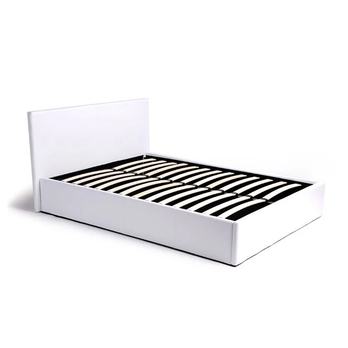 Structure en acier et panneaux de fibres de moyenne densité. Sommier avec cadre en acier, lattes en multiplis. Garnissage en mousse de polyuréthane, revêtement PVC. Fond en tissu non tissé. Tête de lit : 4 cm épaisseur et 89 cm de hauteur. Vendu sans matelas.