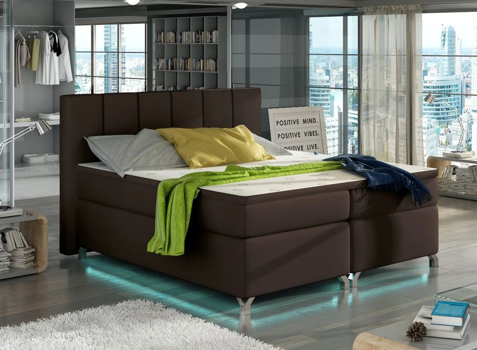 C’est un lit boxspring, caractérisé par un matelas haut, un grand cadre rembourré, une tête de lit haute et un matelas extrêmement doux.