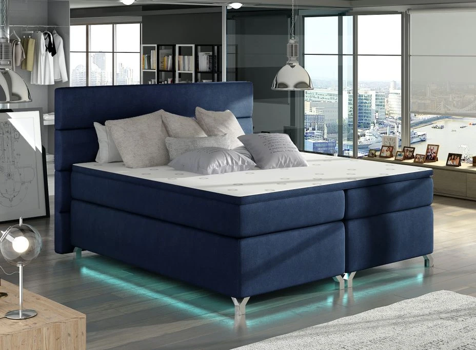 Le lit boxspring Mador est doté d’un matelas haut, d’un grand cadre rembourré et d’un espace de rangement spacieux pour les draps.