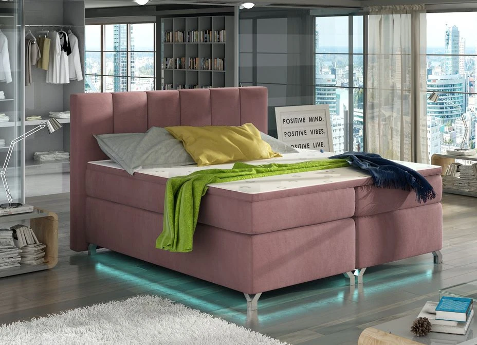 C’est un lit boxspring, caractérisé par un matelas haut, un grand cadre rembourré, une tête de lit haute et un matelas extrêmement doux.