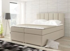 Lit Continental Capitonné Tissu Beige Pozza Avec Matelas 30 Cm En Latex Et Pied Métal Noir
