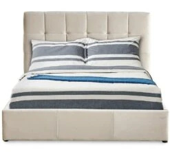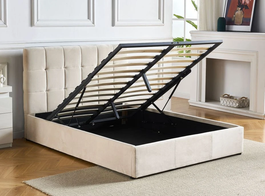 Sous son sommier relevable se trouve un coffre spacieux vous offrant un bel espace de rangement pour vos oreillers, draps et couettes.