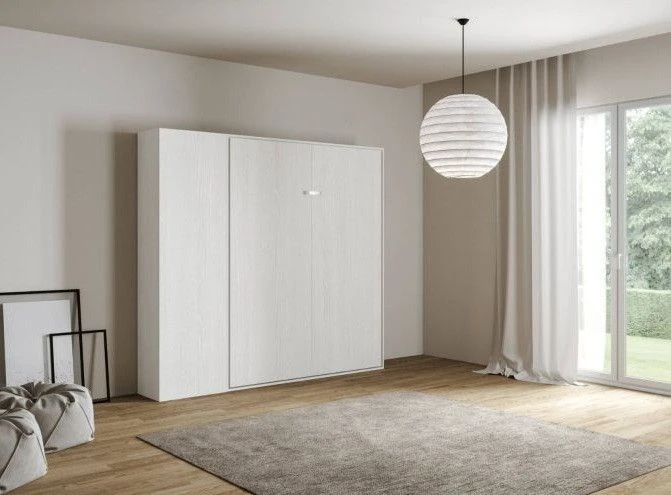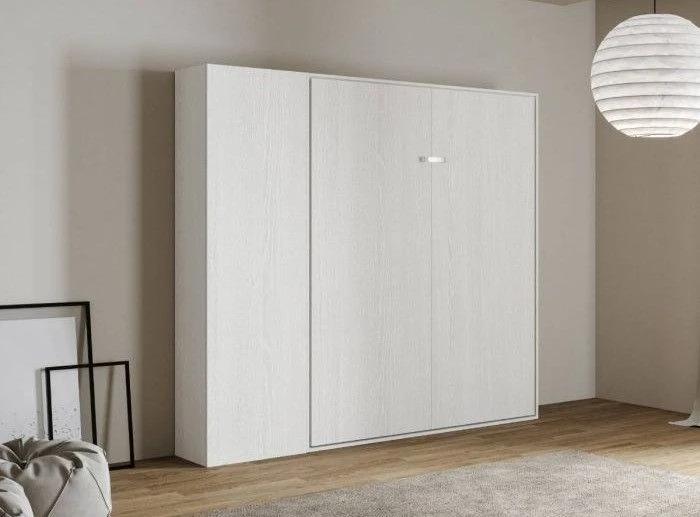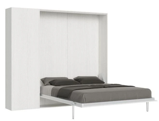 La structure du sommier est en fer renforcé peint avec de la poudre époxy de couleur aluminium gaufré. Les panneaux sont constitués de microparticules de bois de 18 mm en frêne blanc ou essence de noyer. Le mouvement de la descente et de la montée verticales est assisté par des pistons à gaz. Équipé de 2 sangles qui vous permettent de maintenir fermement le matelas en position verticale. Le sommier à lattes est inclus. Matelas non inclus