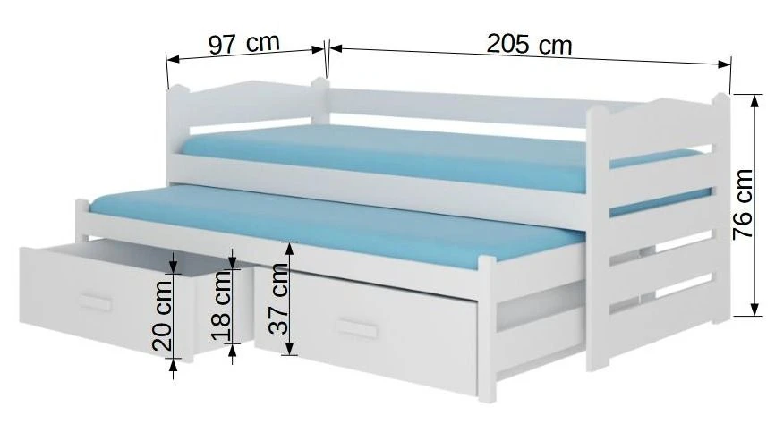 Le lit du bas et les 2 coffres de rangement sur roulettes se glissent sous le lit du haut. Ces 2 couchages de 90×200 cm, permettent à vos enfants de dormir confortablement et en toute quiétude.