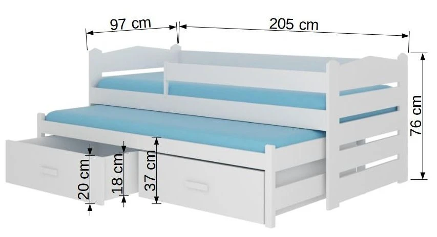 Le lit du bas et les 2 coffres de rangement sur roulettes se glissent sous le lit du haut. Ces 2 couchages de 90×200 cm, permettent à vos enfants de dormir confortablement et en toute quiétude.