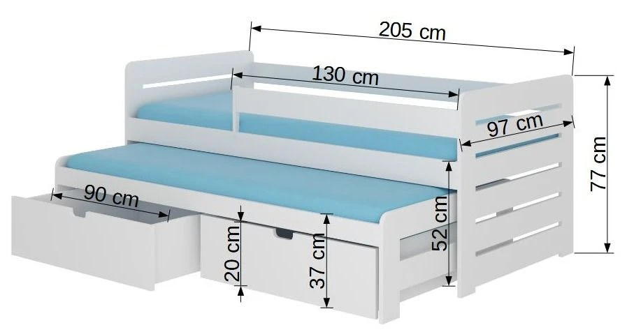 Le lit du bas et les 2 coffres de rangement sur roulettes se glissent sous le lit du haut, offrant ainsi un espace de couchage supplémentaire sans encombrer la chambre. Ces 2 couchages de 90×200 cm permettent à vos enfants de dormir confortablement et en toute quiétude, offrant également la possibilité d’accueillir un ami pour une nuit paisible.