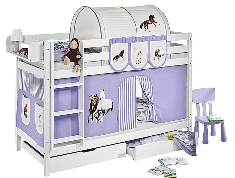 Lit mezzanine avec protection contre les chutes et échelle conformément aux normes EN 747 relatives aux lits mezzanines et aux lits superposés pour enfants.