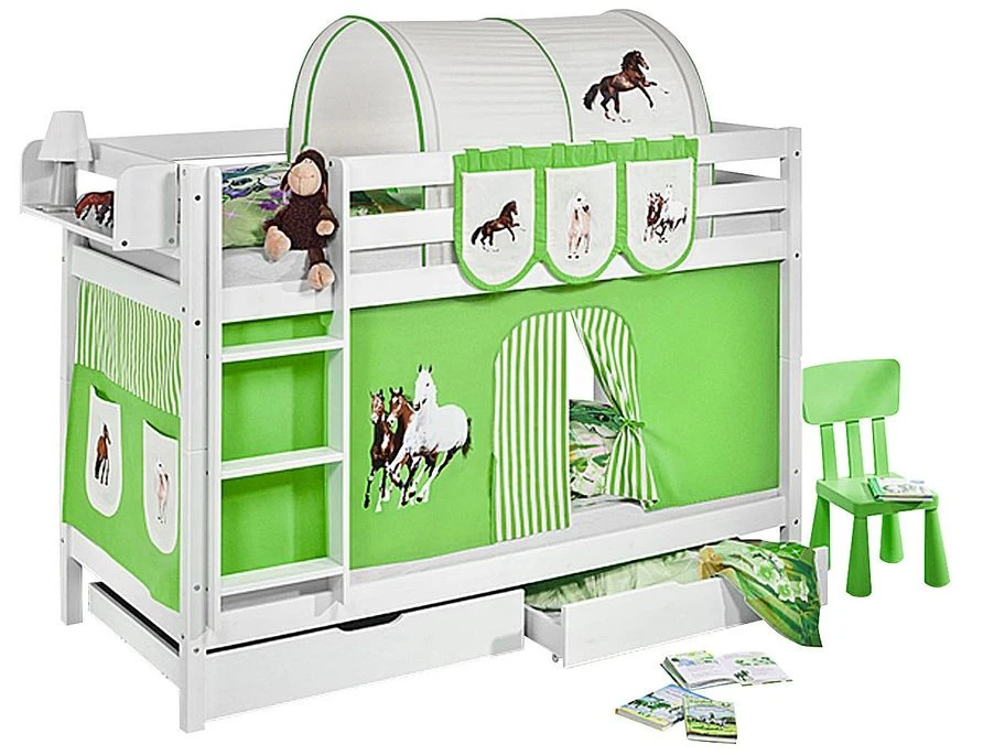 Lit mezzanine avec protection contre les chutes et échelle conformément aux normes EN 747 relatives aux lits mezzanines et aux lits superposés pour enfants.