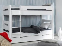 Quelques manipulations simples permettent de transformer le lit blanc en pin massif en deux lits individuels.