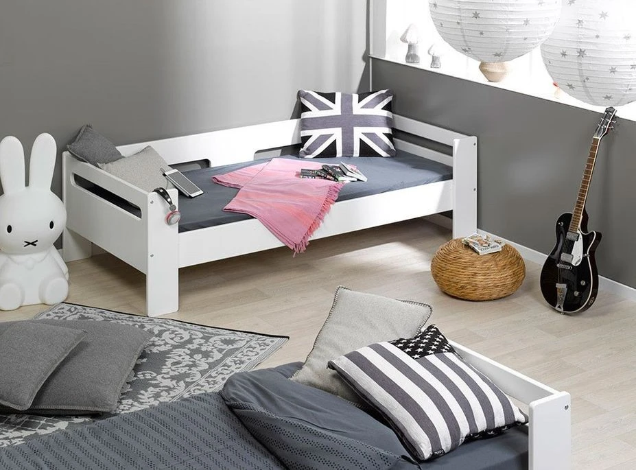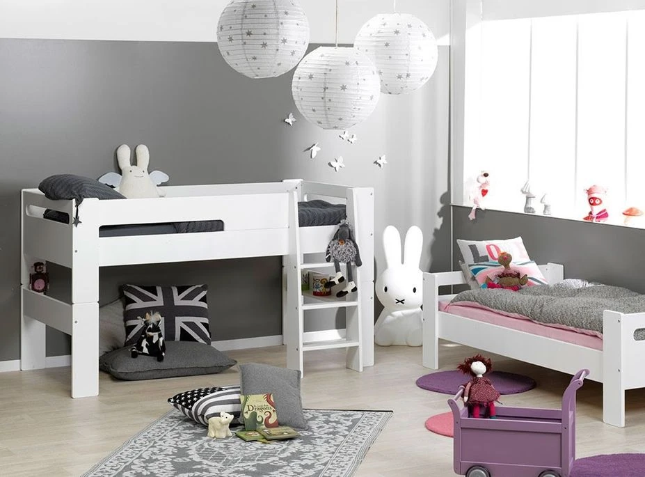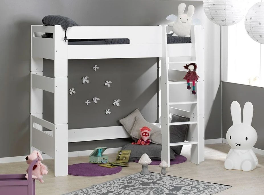 Fabriqué en bois MDF blanc et décor bouleau clair, sa structure peut être séparée en 2 lits simples, vous pouvez aussi le moduler pour avoir un lit simple et un lit mi-hauteur. En retirant le sommier du bas, vous aurez un lit mezzanine et un aire de jeu ou de travail.