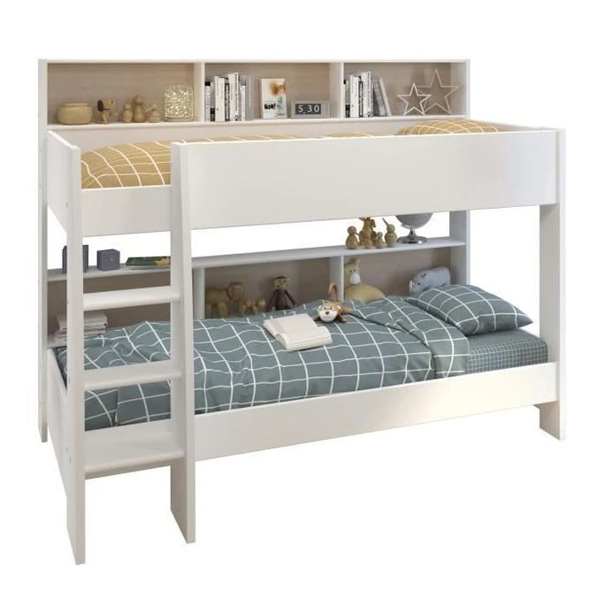 Chaque lit a une bibliothèque horizontale avec un fond qui a un côté blanc et un côté avec un décor en bois de chêne.