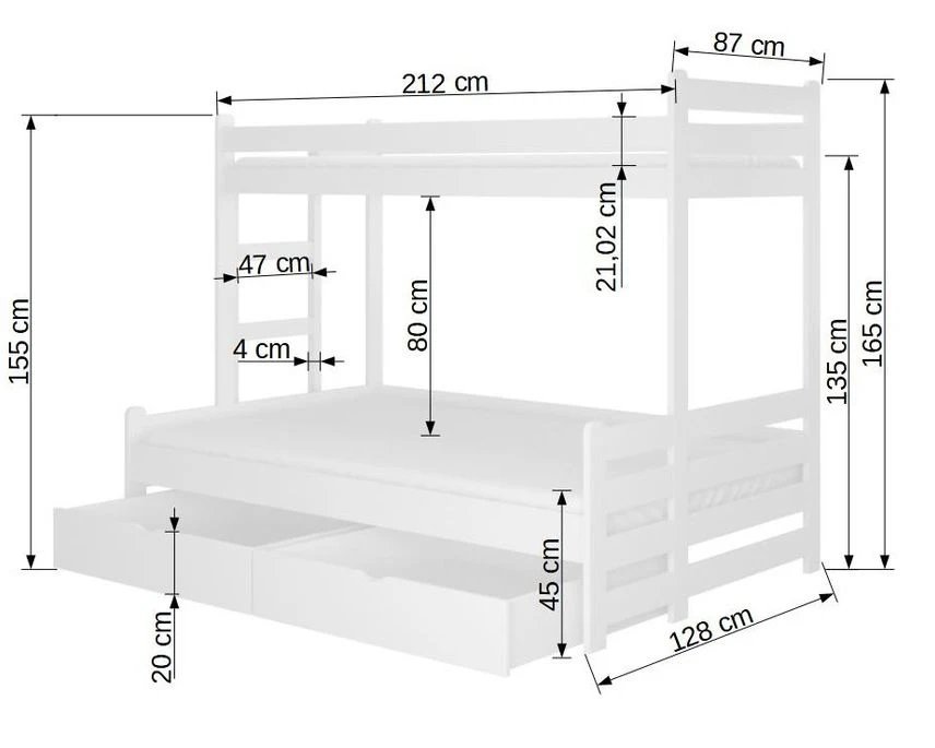 L’ensemble mesure L 212 x P 128 x H 165 cm, adapté aux espaces de toutes tailles. Sa conception élégante et épurée ajoute une touche moderne à la décoration de la chambre, créant ainsi un environnement plaisant où vos enfants se sentiront à l’aise.