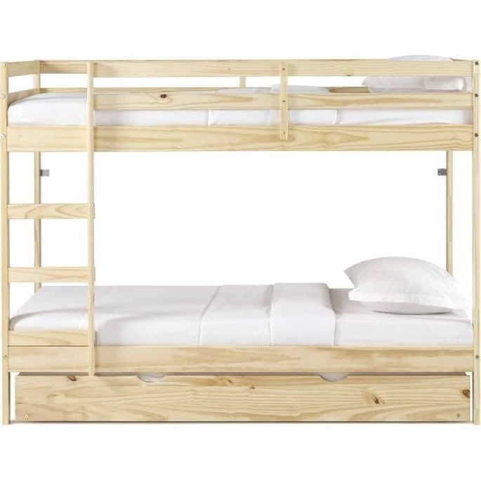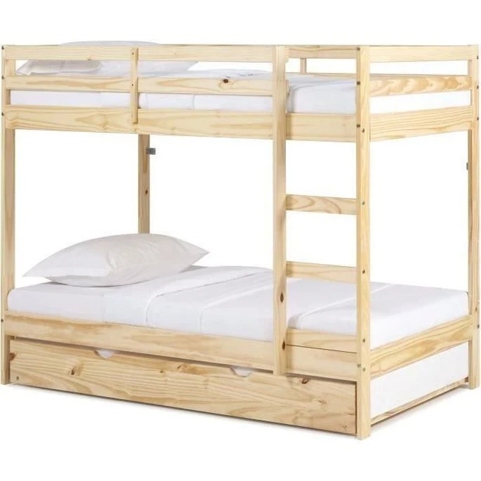 Lit Superposé Enfant Avec Tiroir Lit – Bois Pin Massif – Naturel – Sommiers Inclus – 3 X 90 X 190 Cm – FOSTER