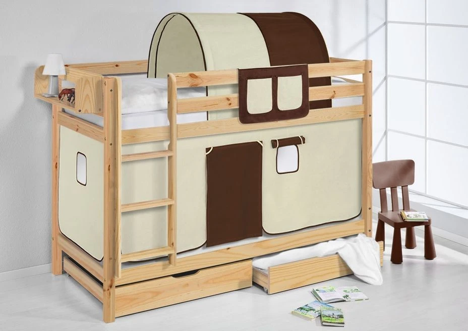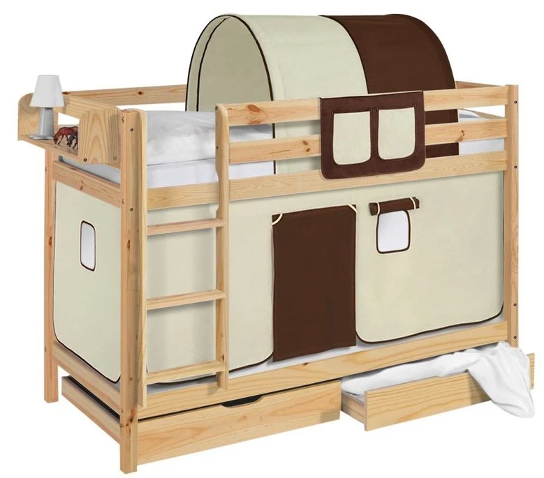 En option, le tunnel, l’étagère, les matelas mousse (de fabrication Européenne épaisseur 14 cm )et le set de 2 tiroirs L 185 x L 85 x H 23 cm par tiroir.