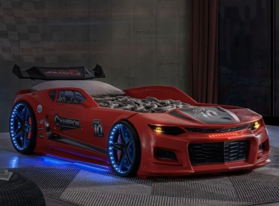Lit voiture enfant vendu avec notice de montage, sommier, LEDS et boitier d’alimentation.